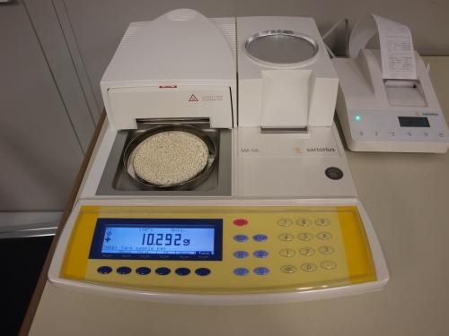 This picture shows the device with the drying chamber open. Inside we see the plastic pellets on its metal tray. When the test starts the white door slides over the metal tray and the drying process begins. the machine automaticallt records the weight and displays it on both the digital display and in a printout form from the subunit to the right