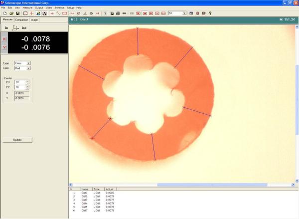 Quabbin uses a video optical microscope with a digital readout, resolution to 0.0005” and direct data download capability. What does this do for us? For starters it’s a lot easier to view the sample on the computer screen than through the eye pieces of a conventional microscope, but that’s just the start. When comparing two samples together samples don’t have to be continuously re-mounted on the microscope because the images have been captured on the P.C. This saves time when switching back and forth between samples. Further, the microscope software and the computer take vary accurate measurements which are not only precise but also easily stored in electronic file for future reference. The photos below depict measuring the wall thickness of the primary insulation of a data cable. It’s important that the copper conductor be located as close to the center of the insulation as possible giving the insulation wall the same relative thickness all the way around the conductor. The photo shows six blue lines superimposed on the insulation sample. Measurements are found on the left. Since this specimen is from a stranded cable, you will also notice the “flower” pattern of the opening in the center of the insulation. The flower pattern is generated by the individual strands in the copper conductor.