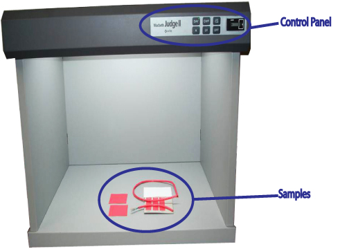 A spectrophotometer is used for color matching. The days of trying to eyeball Pantone® Swatches are a thing of the past at Quabbin. Instead we’ve gone high tech. with the highest level of accuracy available in the market. Consistency and repeatability are critical to a color match. The first step of the process is to standardize the light type. Think about it, samples can be viewed in daylight, incandescent light or fluorescent light and under each lighting scenario the sample can appear to be a slightly different shade. Without controlling the lighting conditions, don’t expect to get a repeatable match. The solution to this is a light box (pictured below). A light box provides a controlled environment because it is closed off on all sides with the exception of the viewing/working side. Further, it will provide illumination that can simulate any of the three different lighting types at the push of a button. The next thing you need is a set of samples. As can be seen in the photo, there are several samples of red inside the light box. Some of the samples are cable and some are flat squares of red material called plaques. Plaques are generally used by color concentrate manufacturers who sell their concentrate to more than just cable companies. When we ask for a color sample of their concentrate they don’t send us a piece of cable, they send us a plaque. Occasionally, some of our customers may be trying to match our cable to their other components, like a boot or a custom rack, etc. If they have the capability, they may also send us a plaque instead of the actual piece of equipment they’re trying to match. In this photo is a set of plaques from the concentrate manufacturer, a set of plaques from our customer and the completed color matched cable, fresh from our plant.