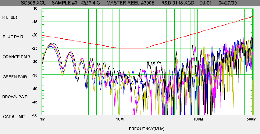 This performance graph shows considerable headroom between the category cable limit line for Return Loss (red) and the test results charted from the 4 individual pairs making up the sample DataMax® cable. Return Loss measures the reflected energy caused by impedance variations in a cable and must be minimized when bi-directional communication at very high data rates is the goal. A cable with inconsistent impedance throughout its length will have more return loss (signal reflections) leading to a distorted and lower strength signal at the opposite end. DataMax® cables benefit from competent design, high performance manufacturing equipment and inline process monitoring, all leading to an end product with very stable impedance, minimal reflections and the fantastic Return Loss graph seen here.