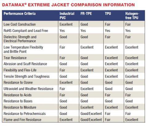 The table provides relative comparison information and performance characteristics for the three IE jacketing compounds. You can see why selecting the right IE cable design is a complex problem.