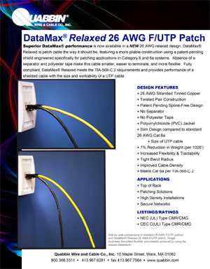 Publication File DataMax® Relaxed 26 AWG F/UTP Patch Additional Quabbin Publications Application - Any -Automation and Harsh Environment Data and Control CableCommercial Data CableDigital AV & Lighting Control CableGeneral Purpose Wire & Cable Electronic, Control, and Power Cable Catalog and Reference Guide Automation and Harsh Environment Data and Control Cable Catalog and Reference Guide The Definitive Guide to Patch Cord Cable Catalog and Reference Guide Quabbin Corporate Brochure — Superior performance in data transmission Quabbin Capability Overview Custom Design Capabilities Proud to be BABAA Compliant DataMax® Patch Cable - Security for mission critical communications Patch Cable Part Number and Connector Reference Guide DataMax® Industrial Profinet Solutions Pagination Current page 1 Page 2 Next page Next › Last page Last »