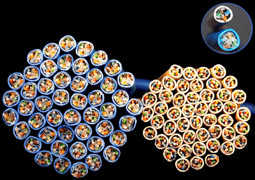 Generally Ethernet cables are comprised of eight conductors arranged in four pairs, with each conductor in the pair twisted around its partner in a helical configuration. Each conductor is covered by an insulating material such as polyethylene or fluorinated ethylene propylene (FEP) to protect the metal wire from environmental exposure degradation and meet electrical performance. The four pairs are optionally wrapped in a shield such as aluminum polyester foil to minimize electromagnetic interference (EMI) and crosstalk. The assembled pairs are then enveloped in a protective outer jacket (e.g., polyvinylchloride) for protection from the environment.