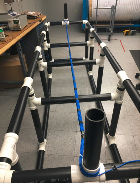 Quabbin’s test setup consists of a fixture holding a bundle of cables through which a constant DC current is delivered by a power supply. Ambient temperature is fixed at 20° C. Thermocouples connected to a data logger are placed inside slits in the center cable and outermost cable as well as on the fixture. Temperature rise at the center of the bundle is recorded for the duration of each test. Each test is run until the temperature has stabilized, a condition defined as a temperature variation of not more than 0.3° C in 15 minutes. The next test is not started until the bundle has returned to ambient temperature. The average duration of a test is 1 hour and 30 minutes. Tests are run for a variety of different bundle sizes, cable constructions and DC current levels.