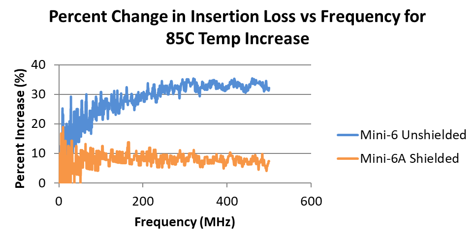 Quabbin has also performed testing on cable performance over temperature on several of their constructions. Terminated assemblies are placed inside bundles of cable and a thermocouple is used to monitor the temperature in a cable next to the assembly. Handheld testers are used to measure cable performance at different temperatures and this data is compared to room temperature cable performance. This measurement was performed the Mini-6 unshielded and Mini-6A shielded cables. The results of this measurement are shown below: