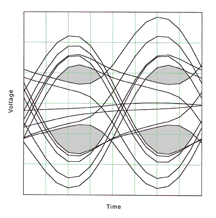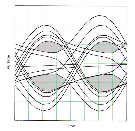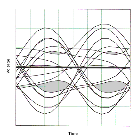 Figure 10 is the eye pattern for channel Model B, which has high return loss and small impedance mismatches. Note the size of the opening in the shaded area. Using the same data pattern, the eye pattern in figure 11 was produced using channel Model C, which had low return loss and high impedance mismatches. Note the smaller size of the opening in the shaded area caused by the lobe in the output pulses. This is increased ISI.