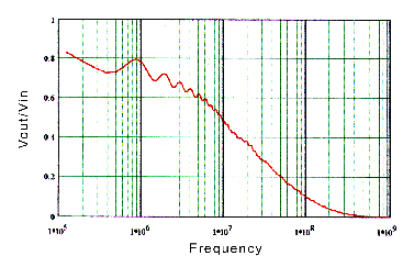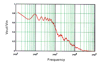 The transfer function for each model was determined using equation (2). For Model A t (f) is equal to 1. Figure 2 is a plot of the transfer function for channel Model A (very high return loss). Note the smooth shape of the curve. Figure 3 is a plot of the transfer function for Model B (high return loss, t (f) close to 1). Note that the curve is similar to figure 2 but has some roughness. Figure 4 is the transfer function for Model C (low return loss, t (f) less than 1). Note that the shape is similar to figure 2 and figure 3 but has more variation with frequency. We expect the effect that channel Model C has on a pulse will be different from that of channel Model B.