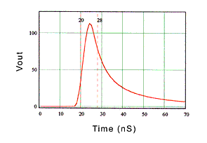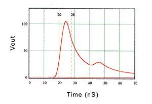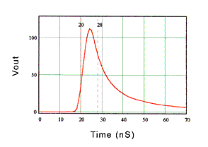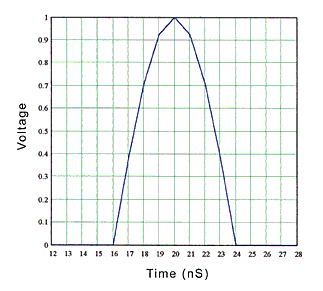 The input pulse used is shown in figure 6. Rise time was approximately 3.4 ns and the pulse width was 8 nS. Although this represents a signal rate (125 MHz) and rise time similar to some current high speed networks, no attempt was made to meet the specific requirements of any network protocol. Using the method outlined above, output pulses were produced using Model A (no return loss), Model B (high return loss), and Model C (low return loss) transfer functions. Figure 7 is the output of Model A. Note that the pulse has spread out due to the attenuation of the cabling. Because the pulse has spread out of the 8 nS window it will interfere with adjacent pulses causing ISI. Figure 8 is the output from channel Model B. Note that the output pulse is very similar to channel Model A output. This is expected because the transfer function of Model B was very similar to Model A. Figure 9 is the output from channel Model C. Note the lobe in the pulse edge, which is not present in figure 7 or figure 8. This distortion is caused by the deviation or roughness of the transfer function from the ideal smooth curve in figure 2.